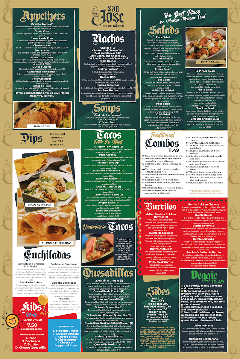 Rib-eye steak cooked with zucchini, squash, mushrooms, bell peppers, and onions. Served with rice and beans. Consuming raw undercooked meats, poultry, seafood, shellfish, or eggs may increase your risk for foodborne illness, especially if you have certain medical condition. To our guests with food sensitivities or allergies, San Jose Mexican restaurant cannot ensure that menu items do not contain ingredients that might cause an allergic reaction.