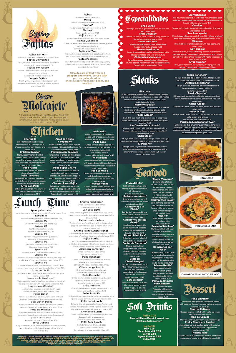 Grilled steak, chicken, shrimp, carnitas, and Mexican sausage cooked with peppers, onions, tomatoes, and mushrooms. Served with rice, charro beans, mixed salad, sour cream, and pico de gallo. Consuming raw undercooked meats, poultry, seafood, shellfish, or eggs may increase your risk for foodborne illness, especially if you have certain medical condition. To our guests with food sensitivities or allergies, San Jose Mexican restaurant cannot ensure that menu items do not contain ingredients that might cause an allergic reaction.