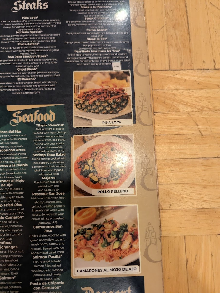 Delicate fillet of tilapia sauteed with fresh shrimp, tomato sauce, roasted poblano strips, and olives. Served with your choice of rice or homemade mashed potatoes. Consuming raw undercooked meats, poultry, seafood, shellfish, or eggs may increase your risk for foodborne illness, especially if you have certain medical condition. To our guests with food sensitivities or allergies, San Jose Mexican restaurant cannot ensure that menu items do not contain ingredients that might cause an allergic reaction.